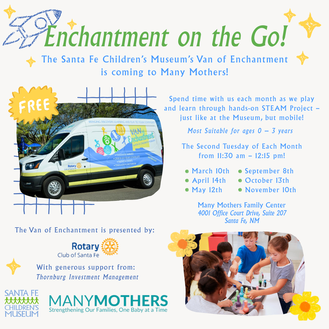 The Santa Fe Children’s Museum’s Van of Enchantment is coming to Many Mothers! Spend time with us each month as we play and learn through hands-on STEAM Project - just like at the Museum, but mobile! Most Suitable for ages 0-3 years. The Second Tuesday of Each Month from 11:30 PM - 12:15 PM! - March 10th - April 14th - May 12th - September 8th - October 13th - November 10th