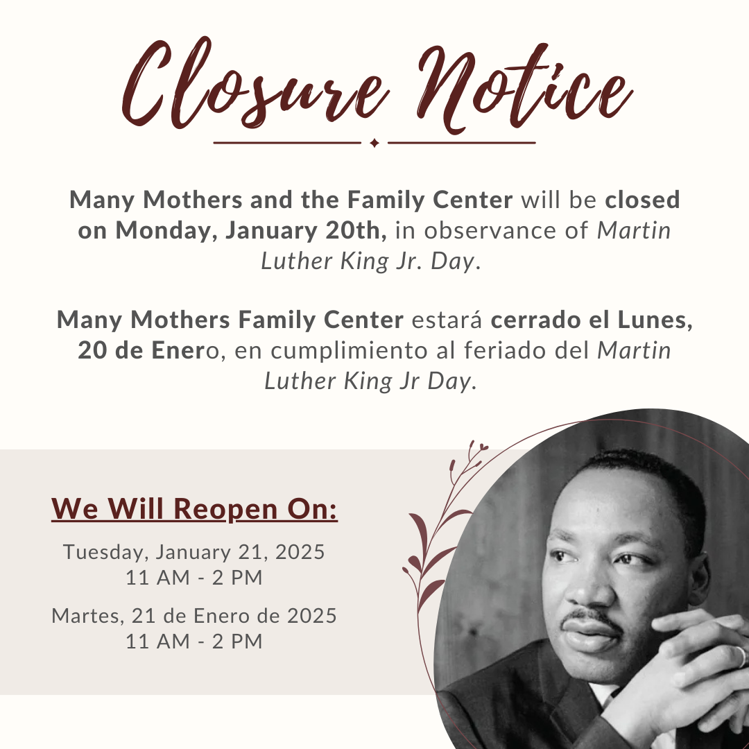 Many Mothers and the Family Center will be closed on Monday, January 20th, in observance of Martin Luther King Jr. Day.