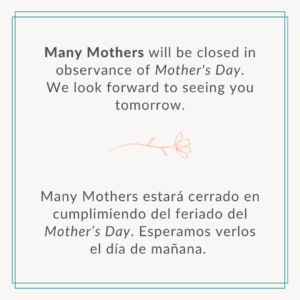 Many Mothers and The Family Center will be closed, Monday, May 13th, in observance of Mother’s Day.