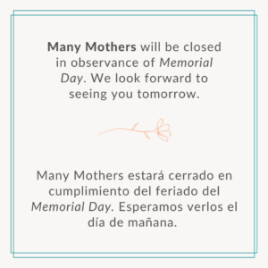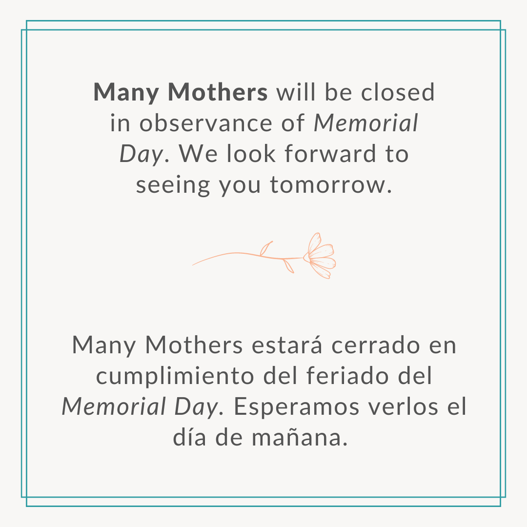 Many Mothers and The Family Center will be closed today in observance of Memorial Day. We look forward to seeing you tomorrow, Tuesday the 28th, at 11AM when we reopen.